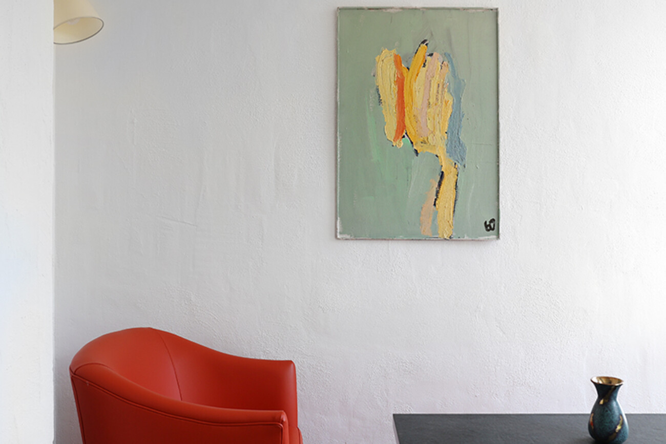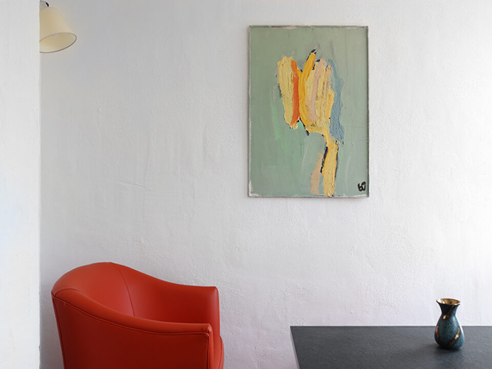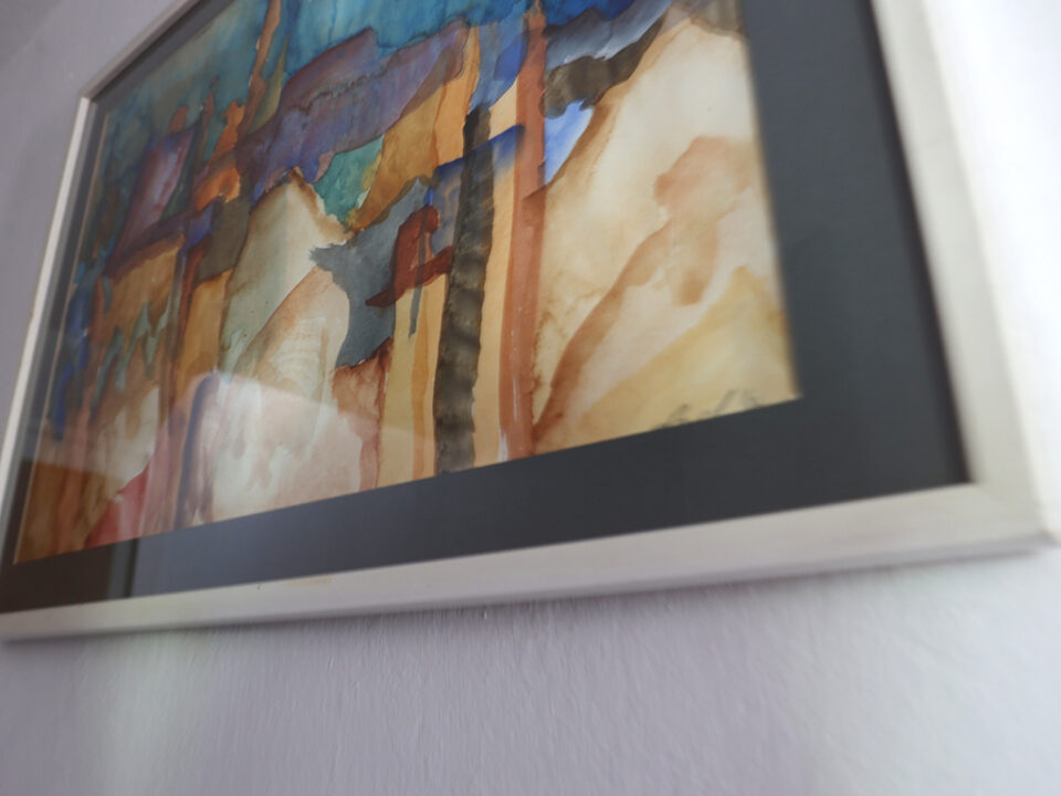 There are only a few pictures that have been hung so far. Two in Cologne-Holweide, one in Cologne-Ehrenfeld, a few in the Eifel, one in Gilching, one in Munich, one in Knutsford, England and another in the south of England as well 5 in Berlin and one in Brussels. A watercolour from the Halmac series is probably in Munich and the oil painting of the waiter with the kissing fish in Cologne.