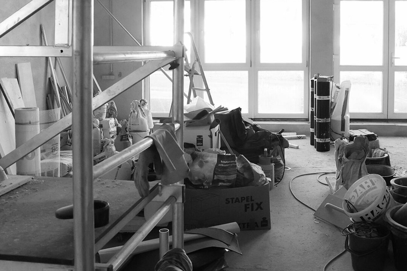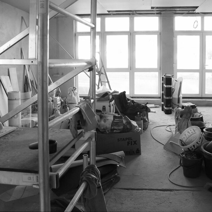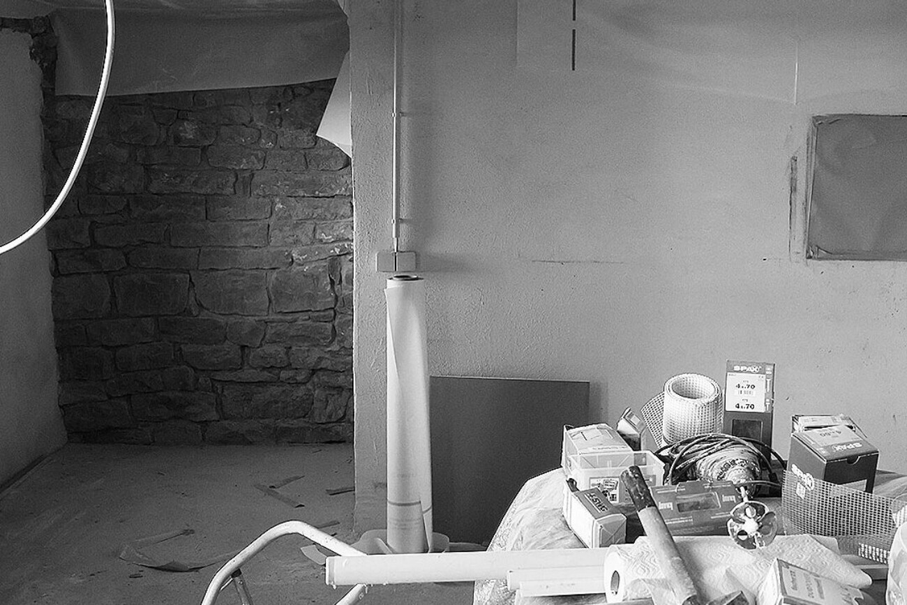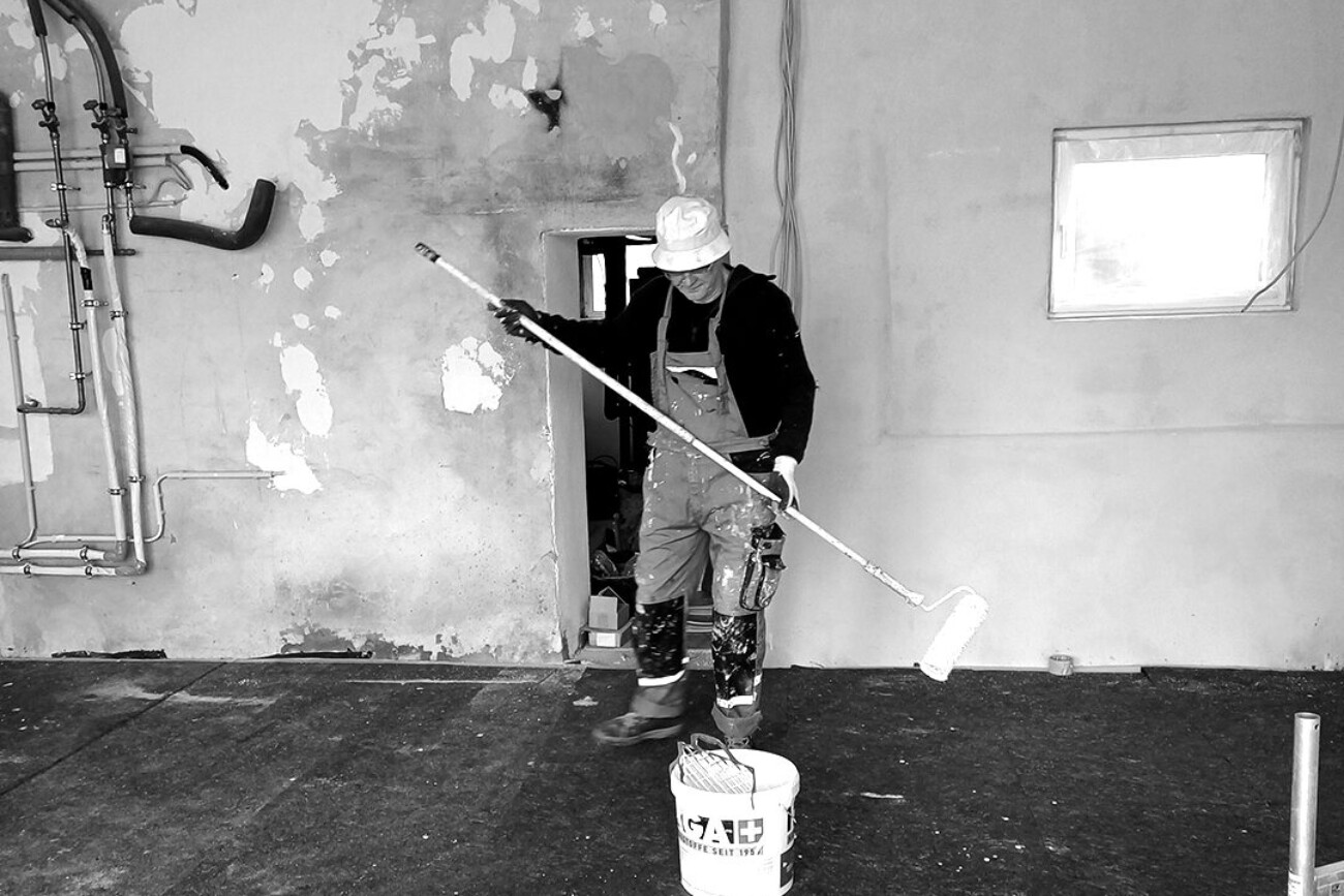 A workshop filled to a height of one and a half metres with things that people had not cleared away for decades. Dust: building dust, decades of dust, cobwebs, tools from another time covered the floor. It took 7 years for it to become the new studio and 28 years for Andi Goral to be able to run a painting studio again.
